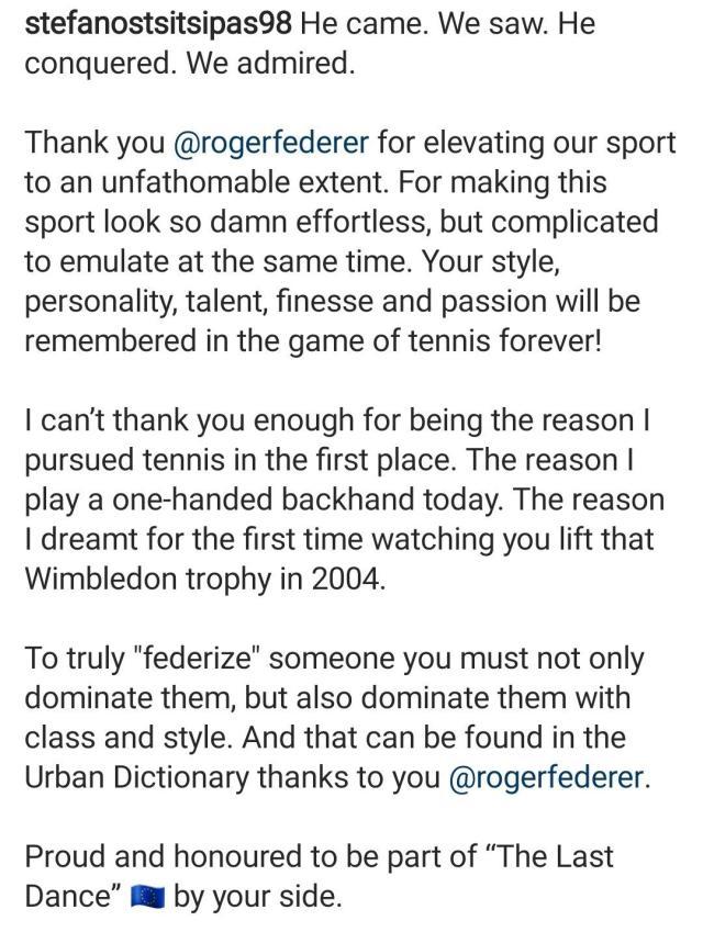 ATP男单世界排名第6位的西西帕斯则用一段长文分享费德勒对自己与网球运动的影响。“他来了,我们见证。他征服,我们敬仰。”西西帕斯写道,“感谢费德勒把我们这项运动提升到无可比拟的高度。你让这项运动看起来无比轻松写意,但与此同时却又难以超越。网球也将永远铭记你的风度、品格、天赋与技巧。”西西帕斯还提到费德勒也正是自己开始打网球并选择单手反拍的原因。